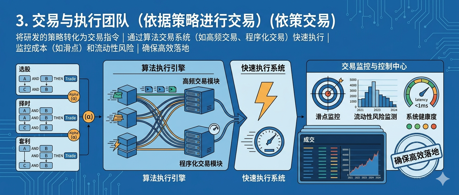 将研发的策略和交易信号(Alpha)转化为交易指令,通过算法交易系统(如高频交易、程序化交易)快速执行买卖操作,同时监控交易成本(如滑点)和流动性风险,确保策略高效落地。