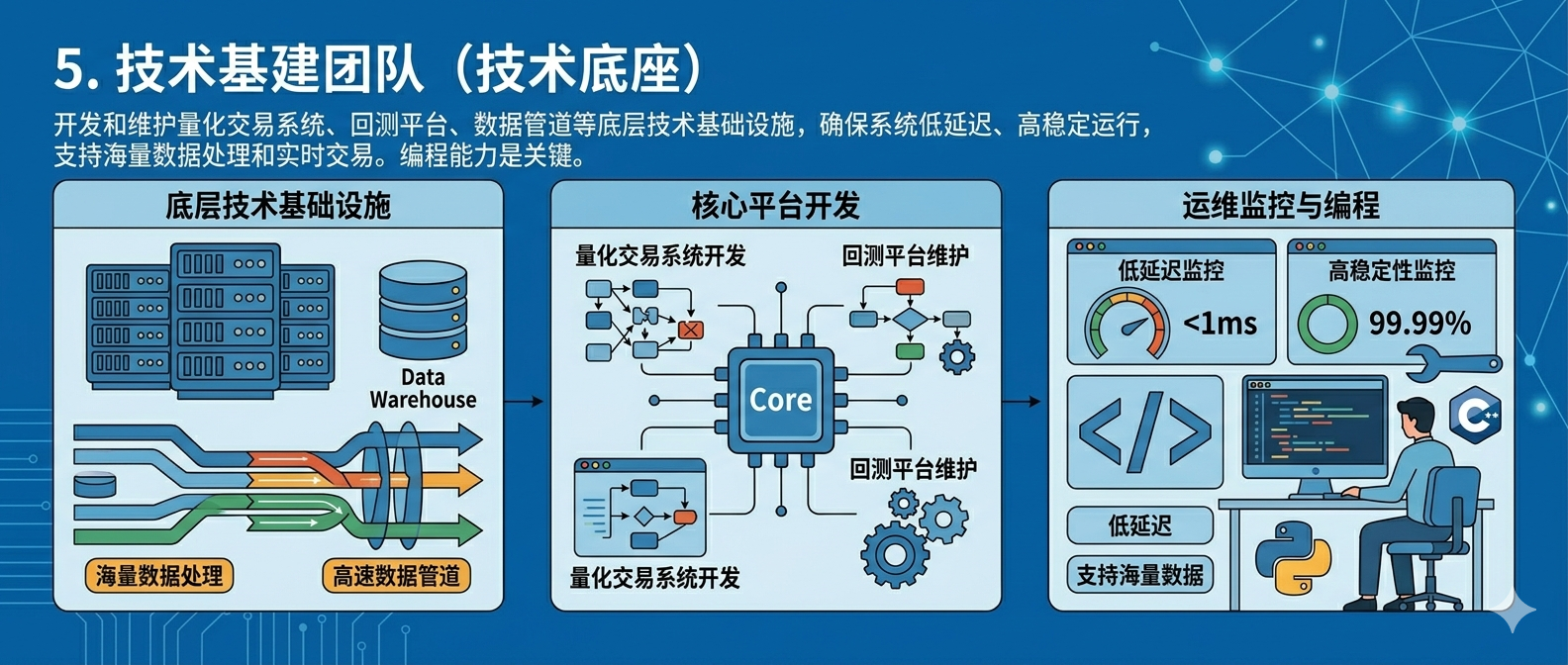 开发和维护量化交易系统、回测平台、数据管道等底层技术基础设施,确保系统低延迟、高稳定运行,支持海量数据处理和实时交易。编程能力是关键。