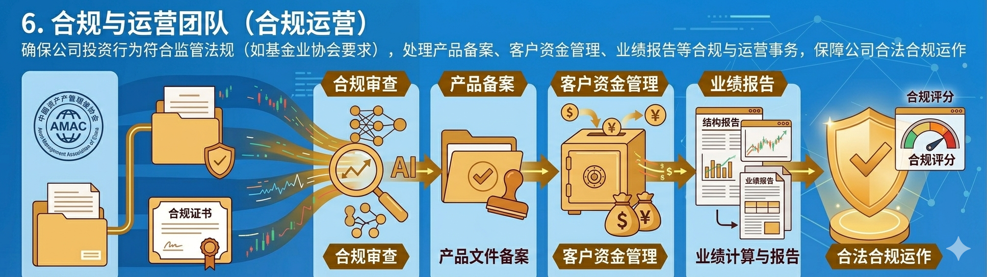 确保公司投资行为符合监管法规(如基金业协会要求),处理产品备案、客户资金管理、业绩报告等合规与运营事务,保障公司合法合规运作。
