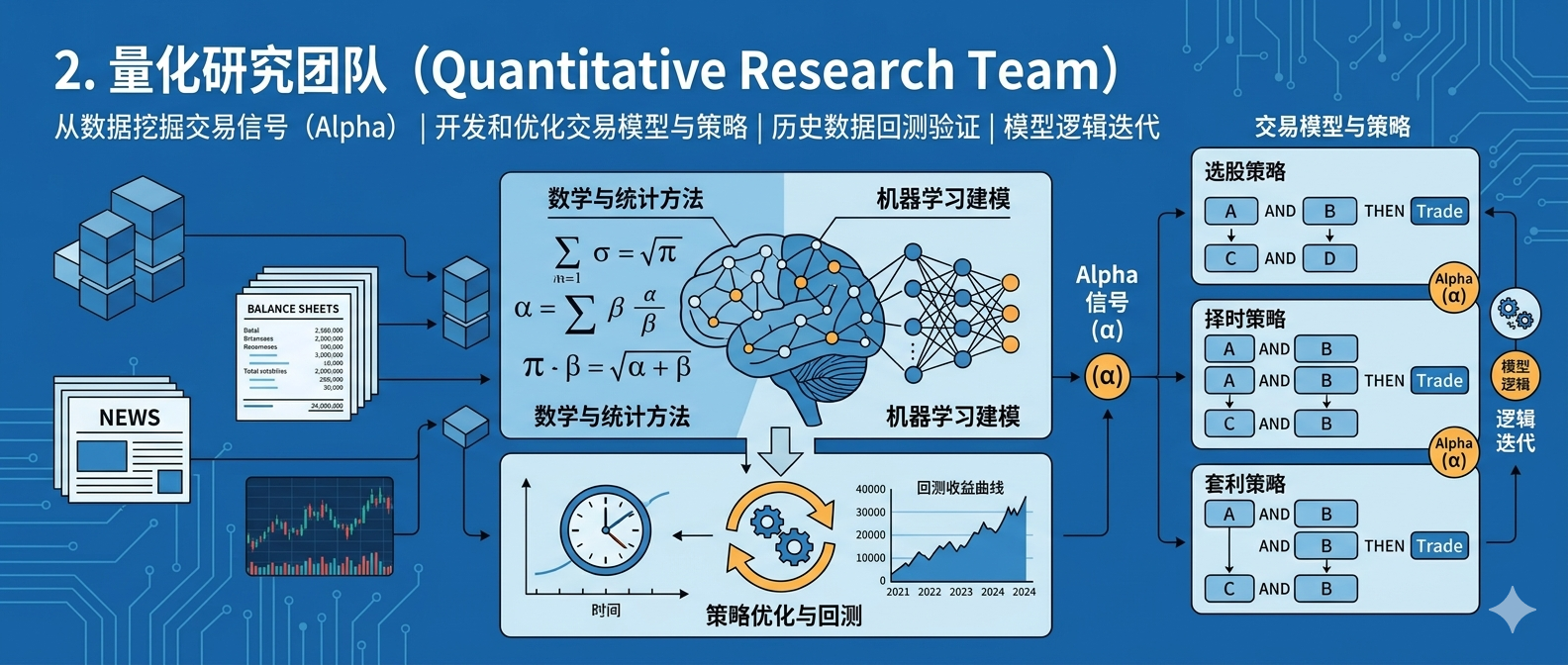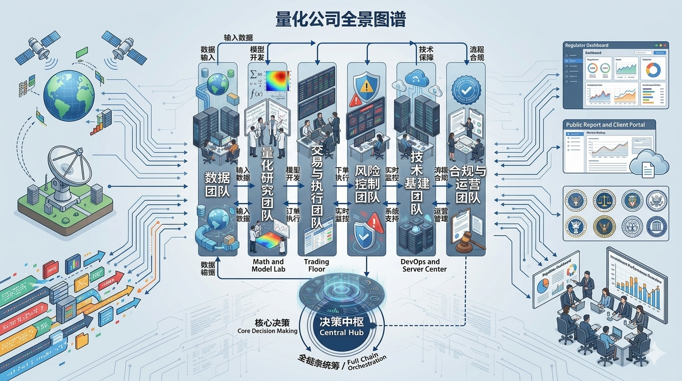 量化公司是一台由数据做燃料、策略做导航、技术做引擎、风控做刹车的精密投资机器,以下是量化公司的工作组成: