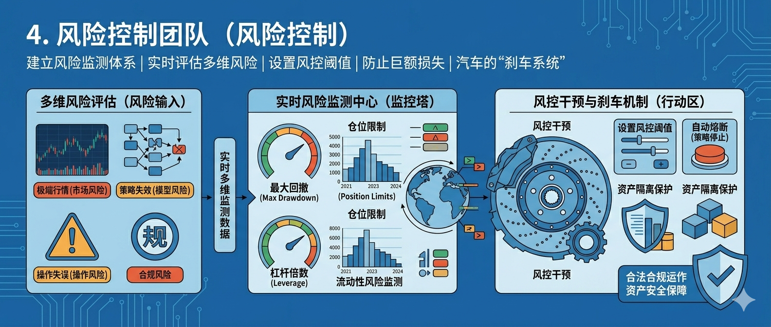 建立风险监测体系,实时评估市场风险、模型风险、操作风险等,设置风控阈值(如最大回撤、仓位限制),防止策略失效或极端行情导致巨额损失。类似汽车的“刹车系统”。